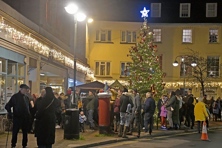A giant Christmas tree dominates The Square, Wiveliscombe, as the town's festive lights are switched on.